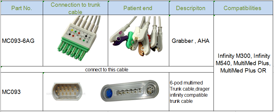 Naši proizvodi uključuju sljedeće (1). Spo2 senzor za višekratnu upotrebu i jednokratnu upotrebu, spo2 adapterski kabel (2). Pacijent monitor EKG kabela i olova (3). Elektrokardiografski kabl i žice. (4). Manžetna za krvni pritisak za višekratnu upotrebu ili jednokratnu upotrebu (NIBP). infuzorska kesa. (5). sonda za nadzor pacijenta TEMP temperature (6). Pacijent monitor IBP kabela i IBP pretvarača (7). Olovka ESU (8). Kružni plastični / metalni konektor sa samo-zaključavanjem.